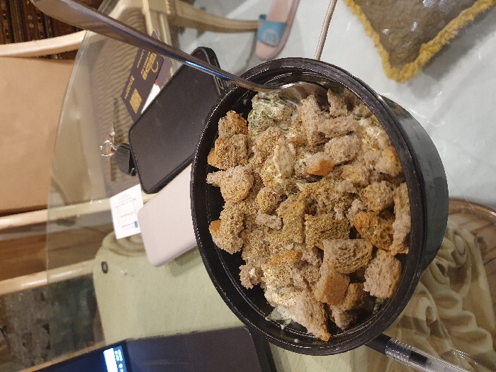 - "An overhead shot displays a black plastic take-out container filled with a salad-like dish, heavily topped with brown croutons and green-brown seasoning" by FM-LJRLv2, licensed under CC BY 4.0