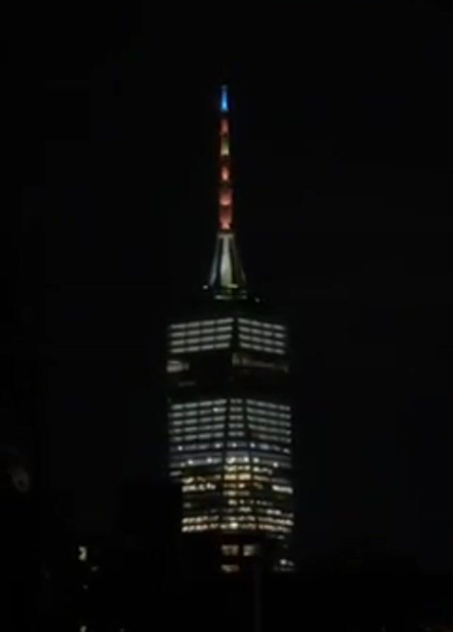 The video depicts a nighttime view of One World Trade Center. The building is illuminated with white and blue lights, while the spire is lit with a rainbow of colors. The scene is dark, with the building standing out against the night sky.