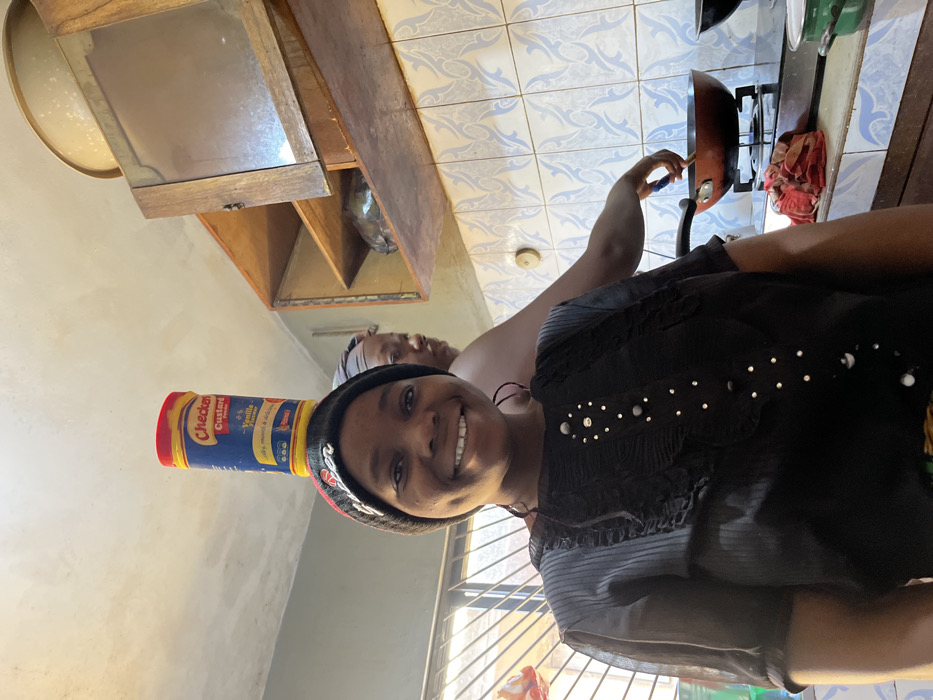 The image depicts a kitchen scene in Jos, Nigeria, featuring two women