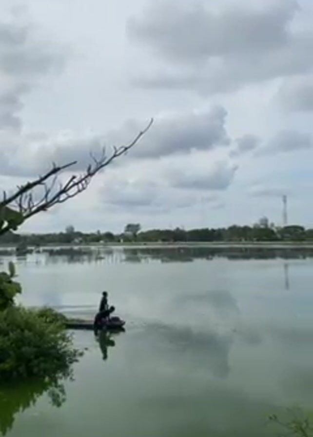 Here’s a description of the video: The video shows a serene scene of a lake on a cloudy day. The lake is a muted green color and reflects the sky. In the foreground, there is a patch of green foliage and a bare tree branch. Two people are in a small boat near the edge of the lake, one appears to be paddling. In the background, across the lake, there are buildings and trees.