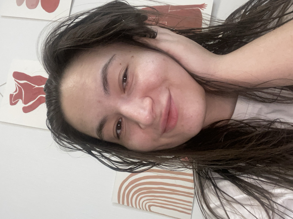 A young woman with dark hair and a fair complexion smiles softly at the camera. Her hair appears wet or damp, and she rests her hand near her ear. In the background, abstract art pieces adorn the wall. One shows a figure in red tones, while another features concentric semi-circles in muted earth tones. She wears a white shirt. The image has a casual, selfie-style aesthetic.