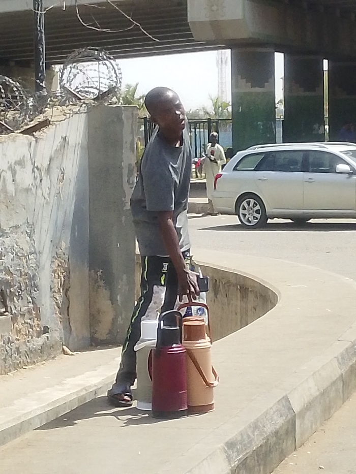 An adult male stands on a sunlit concrete pavement under an elevated overpass in Tarauni, Nigeria. He is bald and wears a grey short-sleeved t-shirt, dark athletic pants with white side stripes, and dark sandals. His right hand grips the handles of three large, cylindrical insulated thermoses that rest on the ground beside his right foot. The thermoses are off-white, dark red, and light brown. He is looking upwards and to his left. To his left is a concrete retaining wall topped with multiple coils of razor wire. In the background, a light-colored station wagon is visible on a paved road, and a person in light-colored traditional clothing stands further down the road. Concrete pillars supporting the overpass are also present in the background.