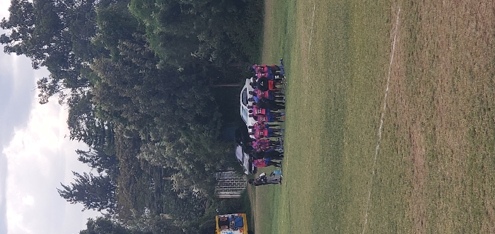 The image displays an outdoor scene on a grassy sports field within the City of London ward, Kenya, under an overcast sky with patches of brighter clouds. Approximately 20-25 individuals are gathered in a close huddle on the field, positioned centrally in the midground. Most individuals wear matching athletic jerseys, primarily in pink/red and blue/black with visible numbers (e.g., 11, 22), suggesting a sports team. Several individuals within or near the huddle wear darker clothing, possibly coaches or support staff. A water cooler or container rests on the ground near the left side of the huddle. The field itself is green with some worn, brownish patches, and a faint white line is visible horizontally across the lower portion of the frame. In the background, from left to right, a partially visible yellow and blue vending cart stands near a white, possibly metal, fence. Beyond this, a dark sedan/SUV and a white sedan are parked on an unpaved surface. A dense line of green trees and foliage forms the furthest background, bordering the field area.