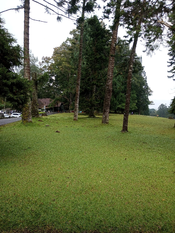 This image depicts a wide, verdant grass field located in Pachmarhi, India, under an overcast sky. In the foreground and mid-ground, numerous tall, slender trees with dark, textured trunks are distributed across the bright green, well-maintained turf. To the left mid-ground, a paved road with several parked light-colored cars is visible. Beyond the road, a low-slung building with a dark, possibly thatched or tiled roof and a prominent covered entrance or veranda is nestled among dense trees. A few indistinct human figures are visible near the building and walking on the grass further to the right. The background on the right shows a gently sloping, open landscape receding into a hazy distance.