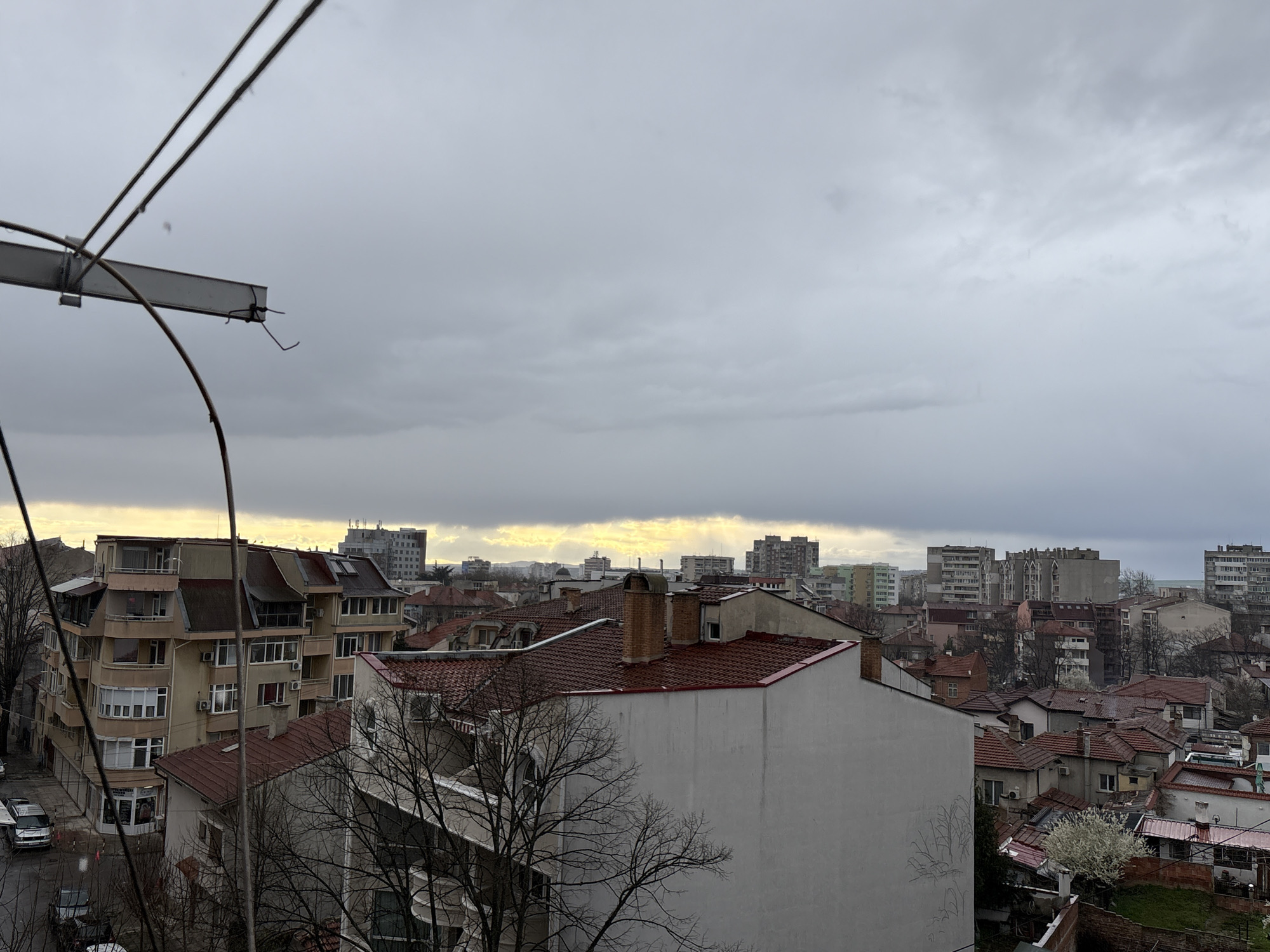 The image presents an elevated panoramic view of the city of Yambol, Bulgaria. The sky is largely overcast, dominated by a uniform grey cloud layer, with a distinct horizontal band of brighter, yellowish-orange light visible on the distant horizon. In the extreme foreground, originating from the top-left, two parallel dark wires traverse diagonally downwards. A metallic horizontal bar is positioned below these wires, from which a short, bent wire structure extends downwards. The midground is densely populated with urban structures, predominantly residential buildings featuring red-tiled roofs. On the left side, a multi-story building with a light-colored facade, multiple balconies (some enclosed), and exterior air conditioning units is visible. A street directly below this building contains several parked vehicles, including one white and two dark-colored cars. Central to the midground is a prominent white-walled building topped with a red-tiled roof and a brick chimney, partially obscuring the view beyond. Numerous other buildings with red-tiled roofs and varied architectural styles extend across the scene. The background reveals a skyline characterized by multiple taller, multi-story apartment blocks, appearing grey against the lighter horizon. Throughout the cityscape, numerous deciduous trees, mostly bare of foliage, are interspersed among the buildings. One tree in the lower-right portion of the image displays white blossoms. No people or discernible human activity are present in the scene.