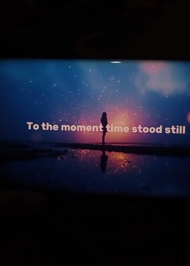 TV screen playing a video with a girl standing near a body of water. Above her and reflected in the water are what appear to be stars in the night sky. The text "To the moment time stood still" appears on the screen, followed by "Where your heartbeat's all I feel."