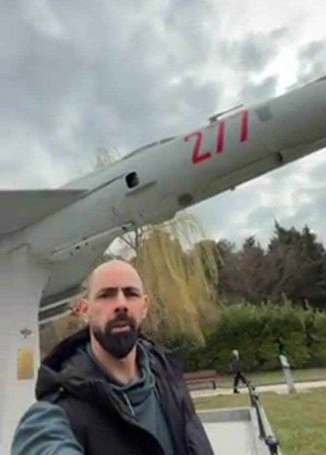 A man with a beard and wearing a black vest over a green top stands outdoors with a fighter jet on display behind him. The jet is light gray with the number 277 painted in red on its side. It is mounted on a concrete pedestal with a plaque. There are missiles attached to the wings of the plane. The sky is overcast, and trees are visible in the background. The man is looking at the camera and appears to be recording a video. The area around the monument is paved.