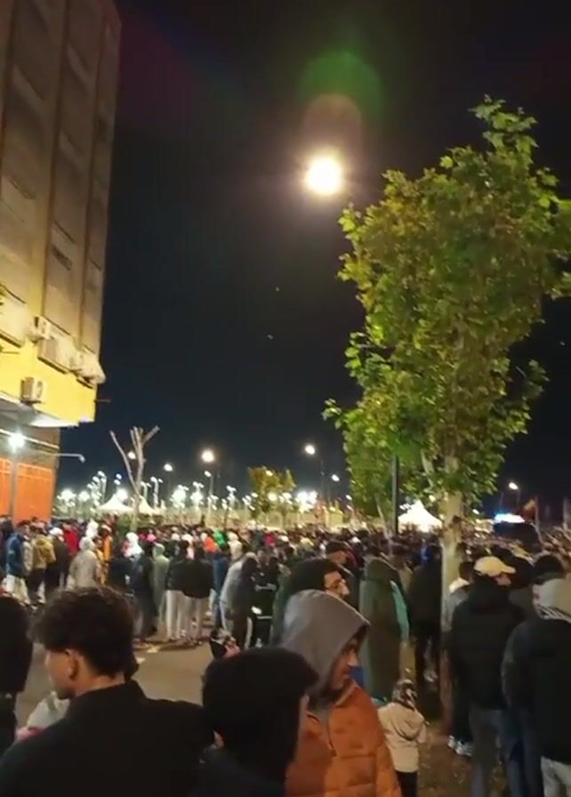 large crowd of people gathered outdoors at night. The area is lit by streetlights, and there is a tall building on one side of the crowd and a tree on the other. In the distance, there appear to be several flagpoles with various flags and what looks like a communication tower. The crowd is dense, with people of various ages and genders. They are all facing towards the flags and tower. The recording appears to be captured by someone in the crowd, walking slowly.