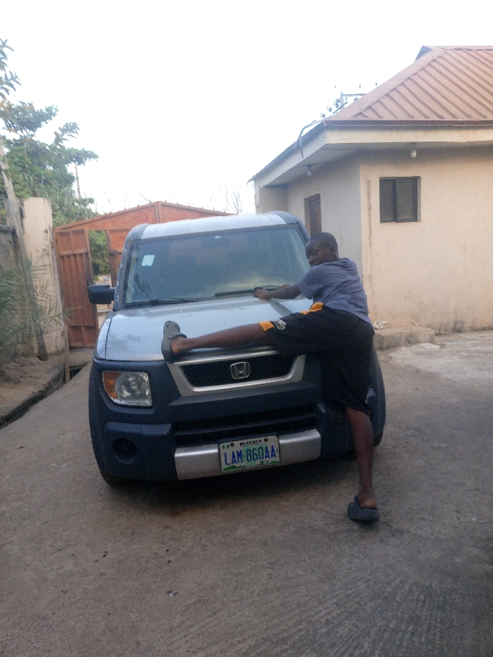 A young man is posing on the hood of a silver and blue Honda Element SUV. He is wearing a gray shirt, black shorts, and dark sandals. He has one leg extended out over the hood of the car and one foot is planted on the ground. The license plate reads "LAM-860AA." Behind the car is a tan house and a brown gate. The scene is outdoors on a paved surface.