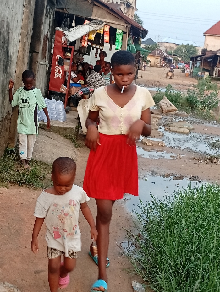 The image portrays an outdoor street scene in Aba, Nigeria. In the immediate foreground, three individuals are present on an unpaved dirt path. A female individual, appearing to be an adult, walks towards the viewer's right. She has short, dark hair and is dressed in a light-colored, short-sleeved V-neck top with button closures and a plain red skirt extending above her knees. She wears light blue slide sandals. A lit cigarette is positioned in the right side of her mouth. Her right hand hangs down, holding a small, light-brown object. To her left and slightly behind, a young male child walks in the same direction, looking downwards. He wears a faded white short-sleeved t-shirt with a colorful graphic print and dark-colored shorts. He is wearing pink slide sandals. Further left, on an elevated dirt verge, an older male child walks, also moving towards the viewer's right. He is attired in a light green short-sleeved t-shirt featuring a cartoon frog design and light-colored trousers. His left hand is raised, touching the weathered, light-colored wall of a building. The ground consists of unpaved dirt with irregular patches of standing water and scattered green grass, particularly dense on the right side of the frame. In the midground, behind the central figures, a makeshift market stall or shop with a corrugated metal roof is visible. A red Coca-Cola branded upright cooler stands to the left of the stall's entrance. Several large, clear plastic bottles of water are stacked on the ground near the cooler. Inside the stall, multiple individuals, predominantly women, are visible, either seated or standing. The background features additional modest structures with corrugated roofs lining a dirt road, where a distant vehicle and indistinct figures are present under an overcast sky.