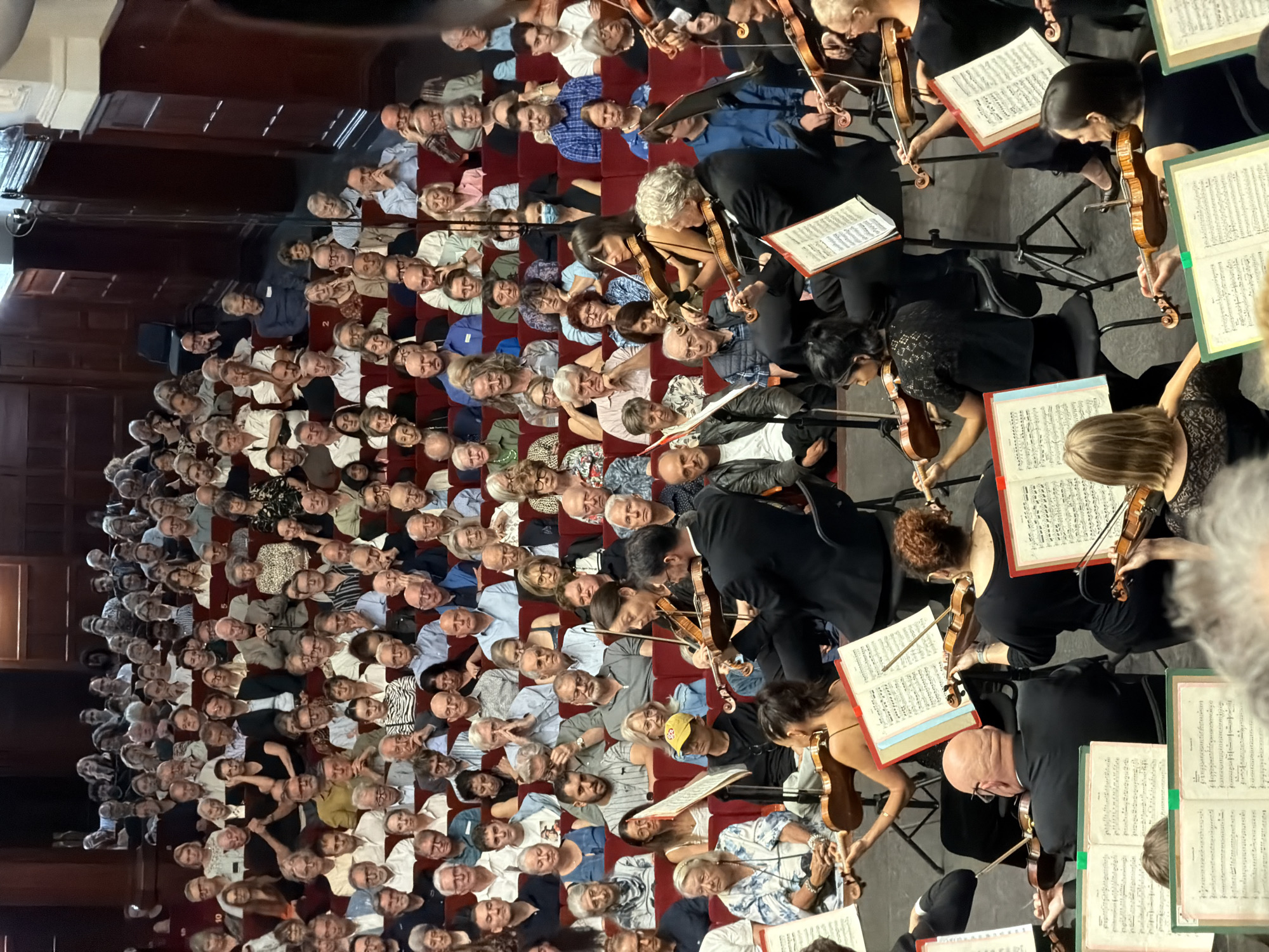 An auditorium is filled with people seated in red chairs facing towards the foreground of the image. In the foreground, musicians are positioned with their backs to the viewer, holding violins and sheet music stands. The audience is comprised of people of various ages. The scene captures a live musical performance. I cannot determine the location in Cape Town, South Africa, from the image alone.