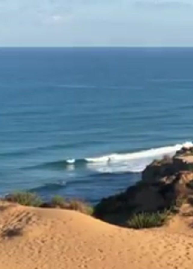 wide shot of the ocean from a sandy dune. The ocean is a calm blue with gentle waves breaking near the shore. The dunes are sandy and covered with sparse vegetation. The sky is clear with a few faint clouds. There are no people visible in the video. The camera remains still throughout the clip.
