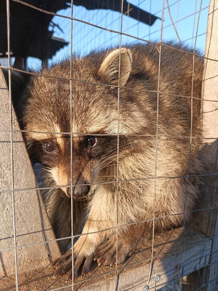 - "A raccoon is observed within a wire mesh enclosure, in what is identified as Балаклавский округ, Ukraine" by FM-YVp303, licensed under CC BY 4.0