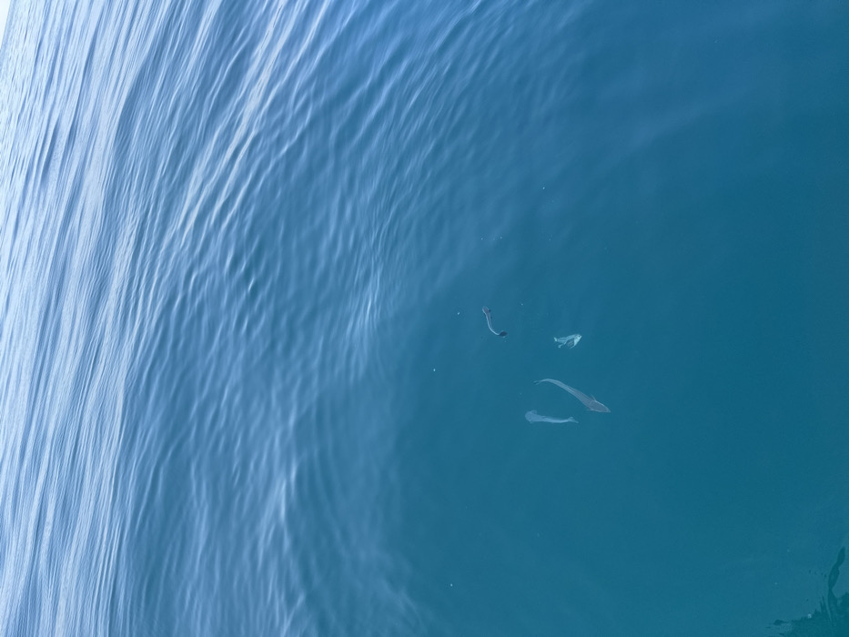 The image displays a calm body of clear blue-green water, exhibiting minor surface ripples