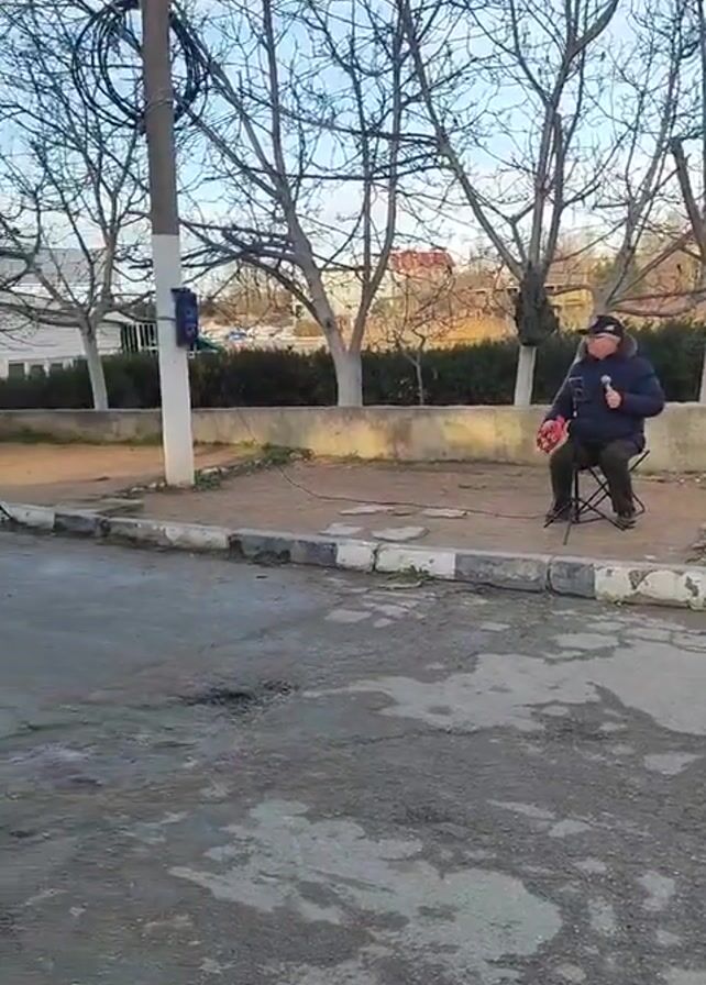 A man is sitting on a chair near a street corner in what appears to be a neighborhood setting. He wears a dark jacket, a hat, and dark shoes. He seems to be talking on a phone and holding something in his other hand, possibly related to a sound setup positioned beside him on a tripod. The sound setup includes a speaker and a box decorated with pictures, suggesting the man may be a street performer or musician. The street is cracked and shows signs of wear. There are trees without leaves in the background, along with residential buildings and a low concrete wall separating the area from a grassy space. Overhead power lines are visible, attached to a utility pole near the man and his equipment. The sky is mostly clear. The overall light indicates it is daytime.