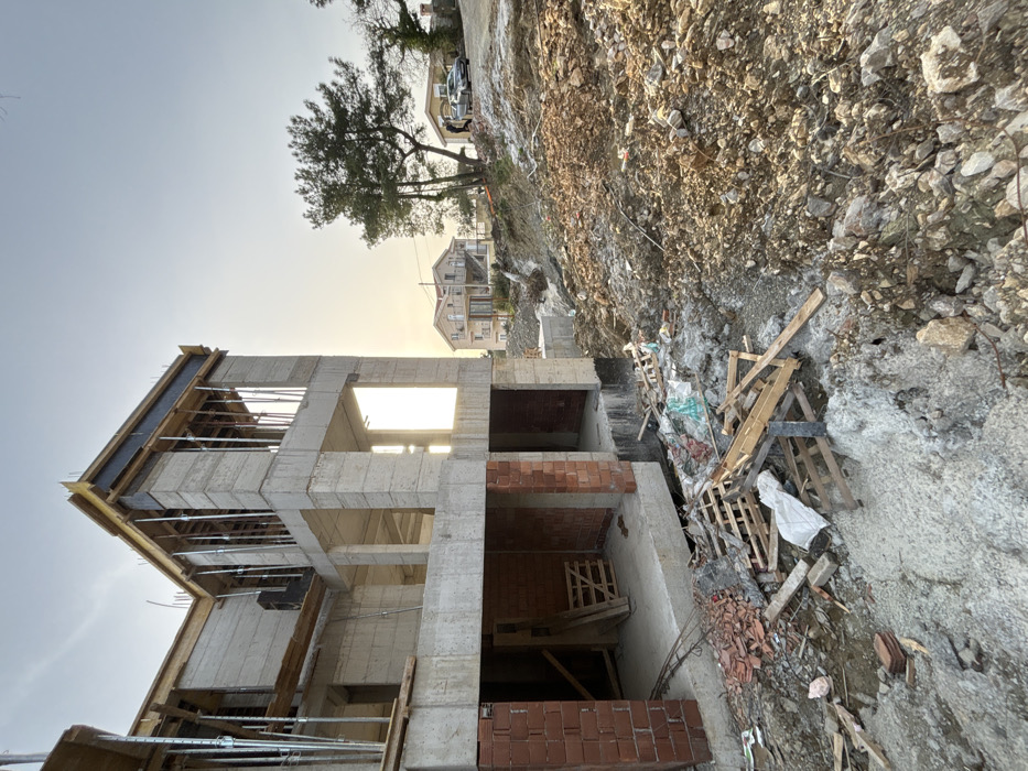 The image captures a residential construction site in Kavač, Montenegro, during golden hour