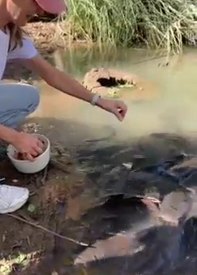 A woman is shown kneeling near the edge of a body of water, feeding a group of fish