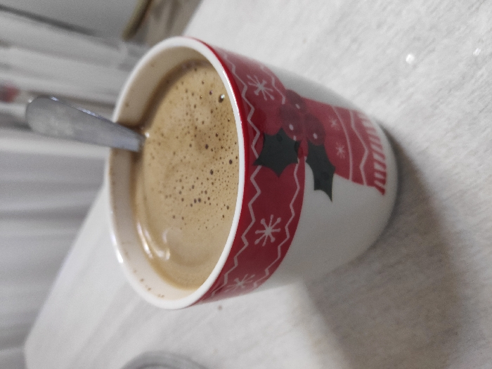 - "A white mug adorned with a festive red and white patterned design sits askew, filled with coffee" by FM-4y4T32, licensed under CC BY 4.0