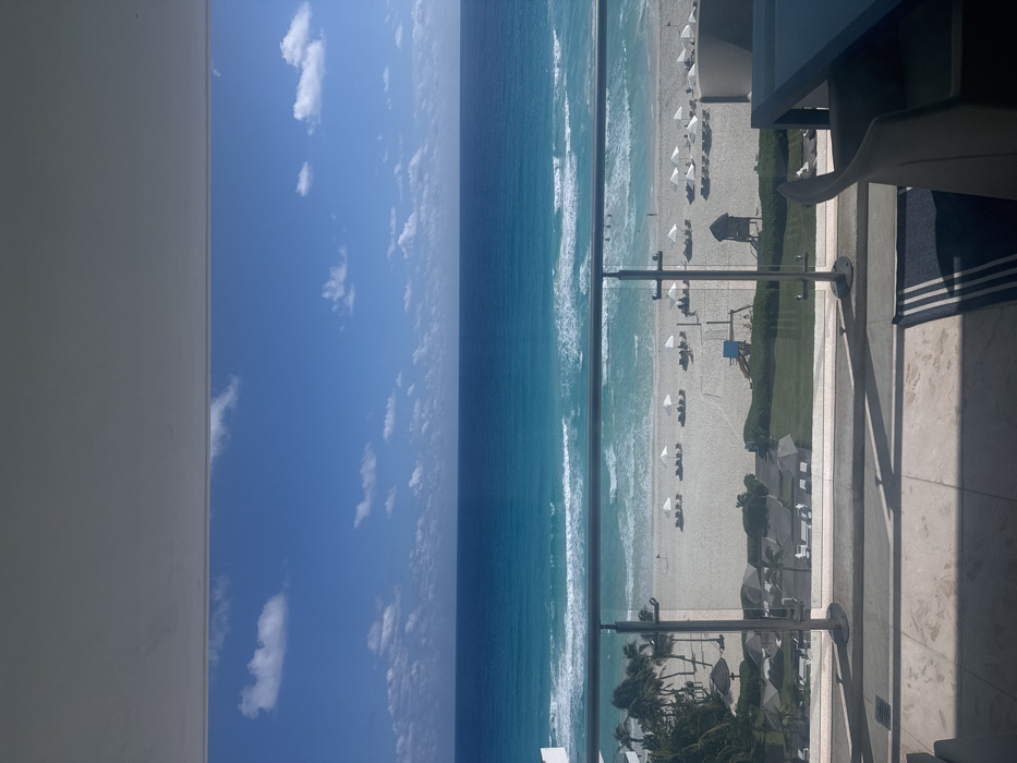 From a high vantage point, likely a balcony, the image captures a beach scene. The turquoise ocean meets a white sand beach dotted with white umbrellas and some palm trees. A clear blue sky with scattered white clouds fills the left side of the view. A glass railing separates the viewer from the beach, and patio furniture is visible in the foreground, suggesting a relaxed, vacation atmosphere.