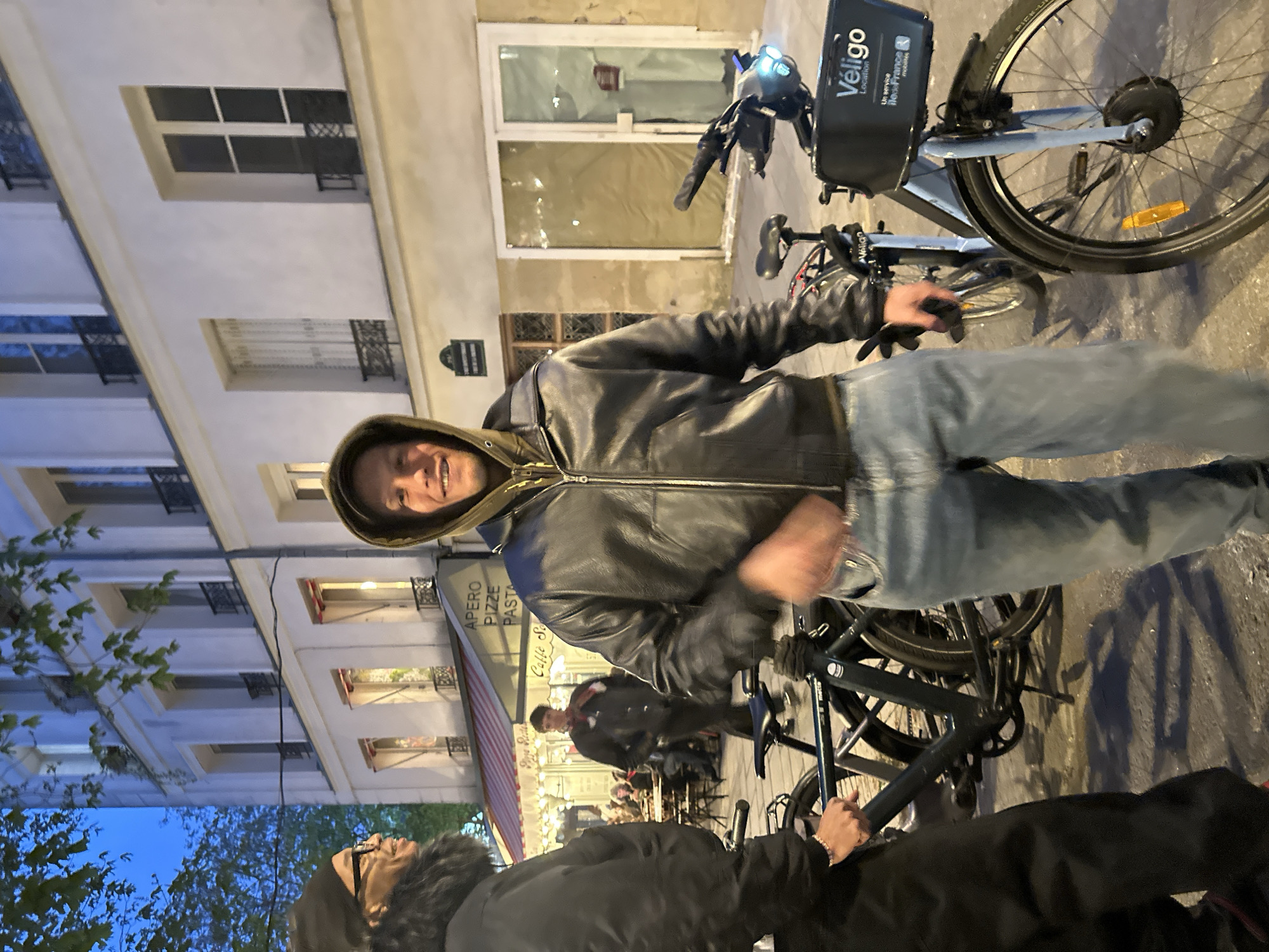 The image depicts an urban street scene during twilight or early evening in Paris, France. In the foreground, a light-skinned male wearing a dark leather jacket over an olive-green hooded sweatshirt and light-wash blue jeans smiles directly at the camera; his right hand is blurred due to motion. To his left, a person of color, partially visible, wears a black beanie, glasses, and a black jacket with a fur-lined collar, looking towards the central figure. This individual holds the handlebars of a black bicycle. A light blue and black Véligo electric bicycle, featuring an illuminated front light and a basket displaying "Véligo Location" and "Île-de-France mobilités" branding, occupies the right foreground. In the mid-ground, an outdoor cafe named "Caffé Sera" is visible with a red and white striped awning and clientele seated at tables. Signage above the cafe advertises "APERO PIZZE PASTA." A person in a dark jacket and patterned scarf is walking away from the camera near the cafe. The background features a multi-story, light-colored building with numerous windows, some equipped with decorative dark iron railings and red and white striped awnings. A typical Parisian street plaque is affixed to the building facade. The sky is a deep blue, and green foliage from trees is visible in the upper left. Artificial lights from the street and buildings illuminate the scene.