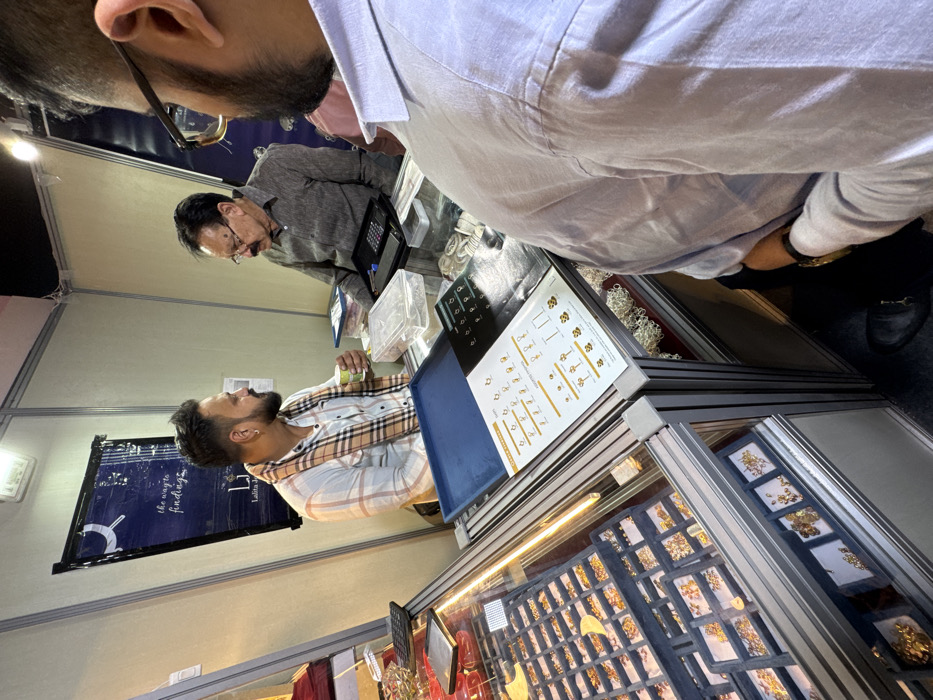 This image depicts an indoor commercial interaction at a jewelry exhibition booth within the Jaipur Municipal Corporation, India