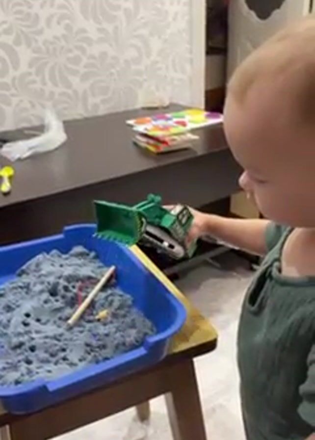 A child is playing with a toy excavator in a blue tray filled with grey sand