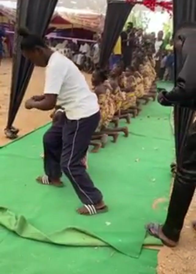 A low-angle view shows a group of children kneeling in a line on a green carpet under a white canopy with black curtains