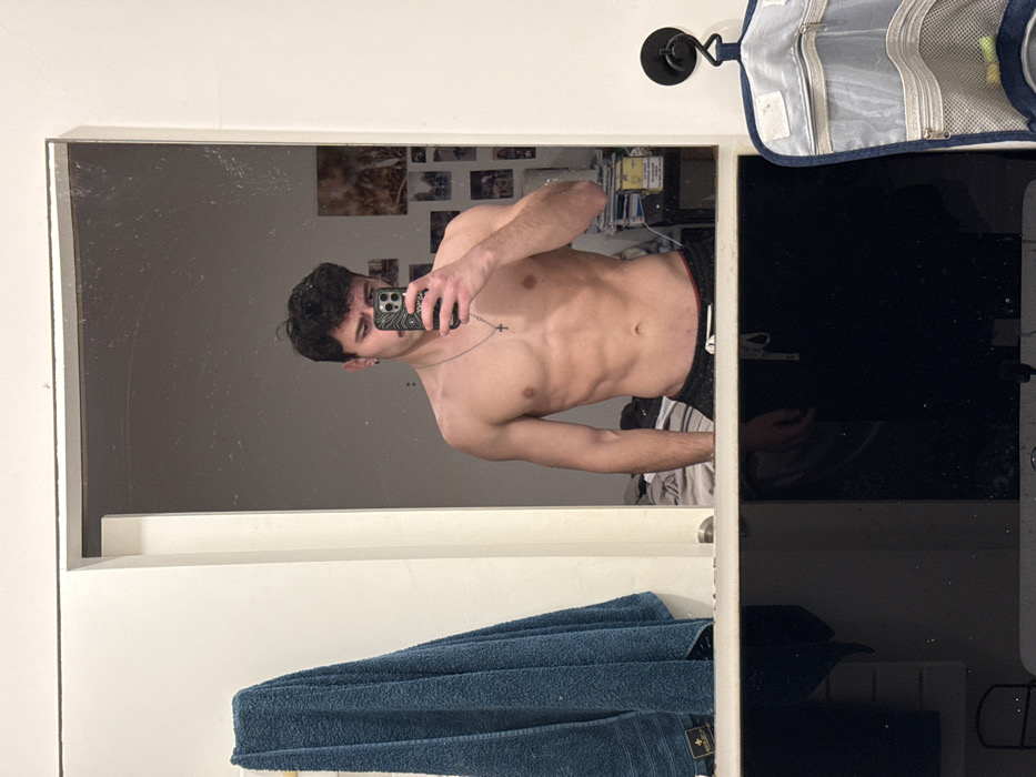 A shirtless man is reflected in a bathroom mirror, capturing a selfie with his phone. He has dark, curly hair and wears a silver necklace. His physique reveals defined abdominal muscles. Behind him in the reflection, a wall is adorned with photos. Below the mirror, a neatly folded blue towel is draped over a rack. To the right of the mirror, a black surface and a hanging toiletry bag are visible.