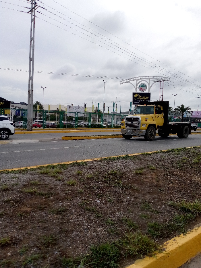 A yellow flatbed truck is traveling on a road with a yellow curb. A white car is stopped on the left side of the road. In the background, there's a shopping center with a Mango sign and a Rumi Plaza sign, with several parked cars. Overhead power lines stretch across the sky, and the sky is cloudy. The foreground shows a grassy area with a yellow curb.