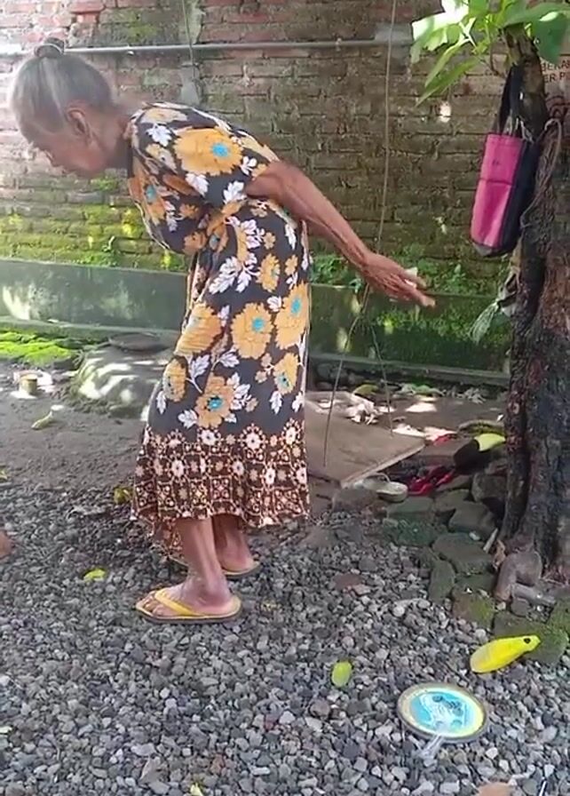 An elderly woman with gray hair pulled into a bun stands in a gravel yard. She wears a floral dress and yellow sandals. She appears to be looking at the ground, bending over with her arms extended for balance. Behind her is a brick wall, a tree trunk with a pink and black bag hanging from it, and a swing set. The yard is covered in gray gravel, and several yellow objects, possibly fruit, are scattered around the ground.