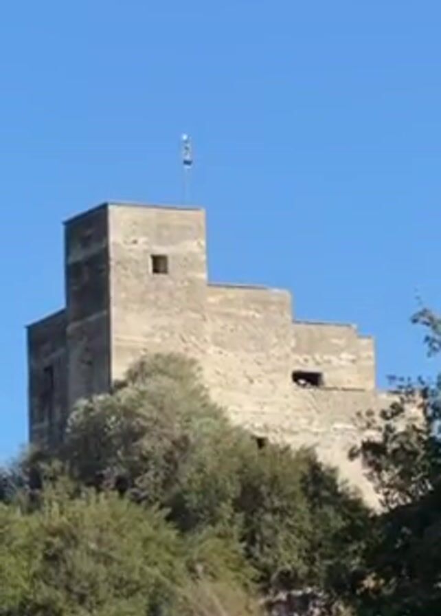 The camera captures a low-angle view of a stone building on top of a hill, possibly a castle or fortress. The building is multi-tiered, with a square tower at its highest point. An Israeli flag is visibly waving on top of the tower. Green trees and bushes are surrounding the base of the hill, partially obscuring its slope. The sky is a clear, bright blue.