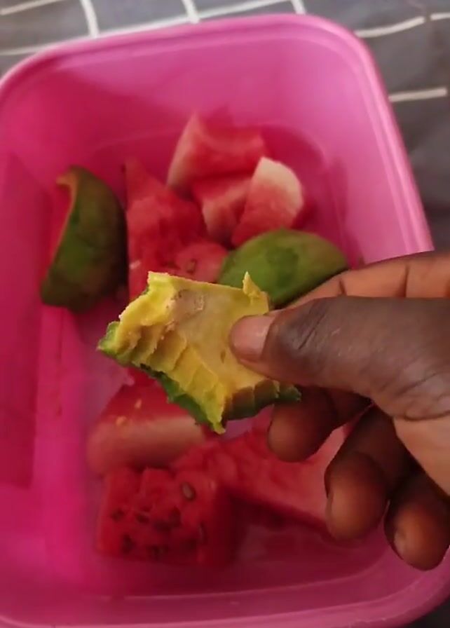 A person is holding a piece of guava from a pink plastic container filled with watermelon chunks and guava pieces