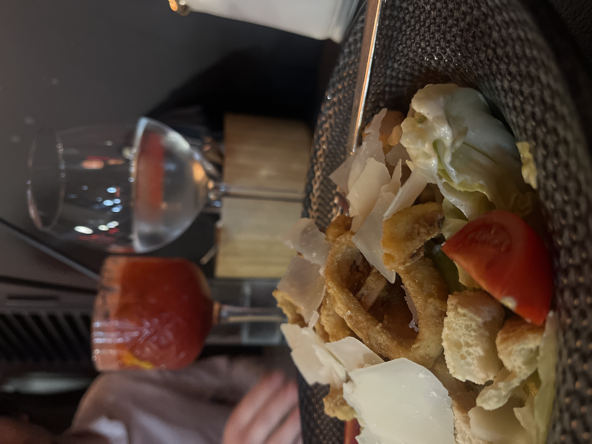 A close-up shot shows a Caesar salad in a gray basket on a table. The salad contains lettuce, croutons, sliced cheese, and tomato. Next to the salad are two wine glasses, one empty and one filled with a reddish-orange liquid. A wooden block is visible behind the glasses. The location is in an unidentified city.