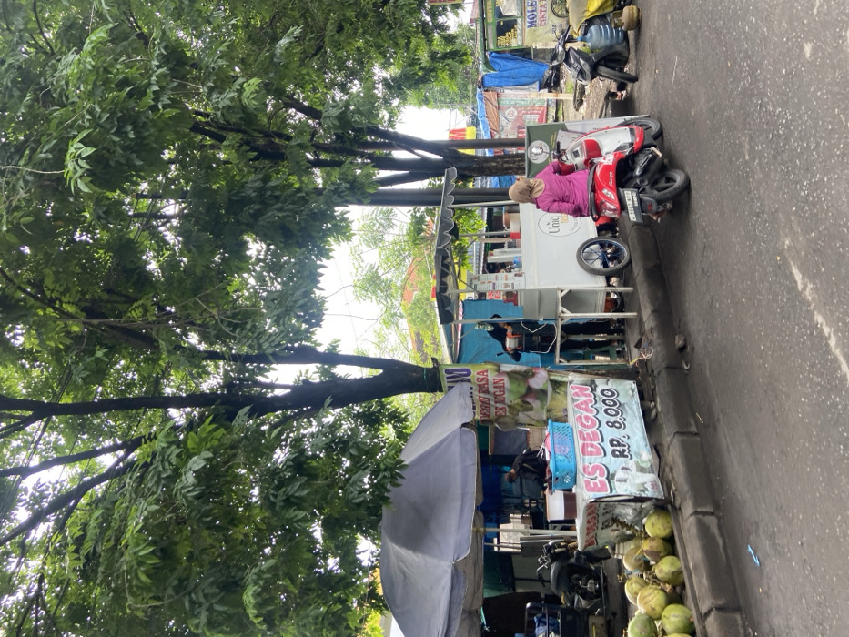 A street scene shows a vendor in a pink shirt, on a red scooter, beside a white cart. Behind the cart, several vendors are seen under awnings. A large tree dominates the left side of the image, its leaves partially obscuring the view. Along the curb, signage for "Es Degan Rp. 8,000" is visible, next to a pile of coconuts. Several parked motorcycles are present along the street.