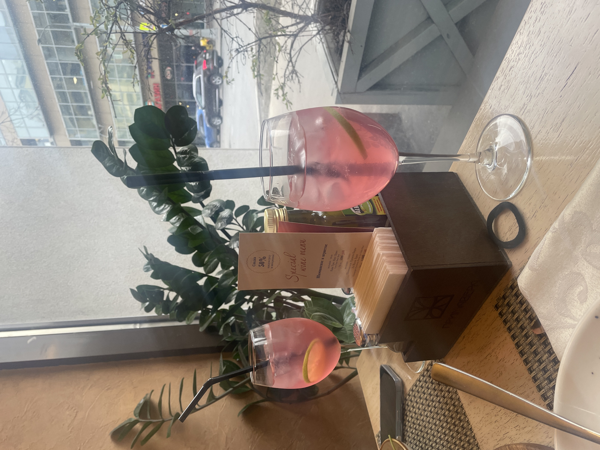 The image depicts the interior of a restaurant or cafe, looking out through a large window onto a city street in Moscow, Russia. In the foreground, on a light-colored wooden table, two stemmed glasses are visible, each containing a pink beverage with ice and a slice of lime, accompanied by a black straw. To the left, a black smartphone rests on a dark patterned placemat, next to a gold-colored utensil. A white, patterned cloth napkin is partially visible beneath. Centrally placed is a wooden caddy containing white folded napkins, displaying a logo and the Cyrillic text "ПРИМАВЕРА" (Primavera). A "Special wine menu" card, featuring Russian text announcing a "50% discount every Wednesday and Sunday" on sparkling and still wines, stands behind the caddy. A partially visible bottle labeled "ALFA Оливковое масло" (Olive oil) is next to the menu. A black hair tie lies on the table to the right of the caddy. Behind the table, lush green potted plants (Zamioculcas zamiifolia) partially obscure the window frame and an interior wall with a light brown textured finish. Through the window, an urban street scene is visible under an overcast sky. Vehicles, including a blue sedan and a dark SUV (possibly an Audi Q5), are present on the wet asphalt road. Across the street, a multi-story building with numerous reflective windows dominates the view. At ground level of this building, a retail establishment is clearly identified by a red and white sign bearing the Cyrillic name "ПЯТЕРОЧКА" (Pyaterochka), indicating a supermarket. Bare tree branches are visible in an outdoor planter box in front of the building across the street. Based on the visible "ПРИМАВЕРА" (Primavera) on the napkin holder and the "ПЯТЕРОЧКА" (Pyaterochka) supermarket across the street, the location is identified as **Cafe Primavera at Bolshaya Ordynka Street, 21s1, Moscow, Russia.**