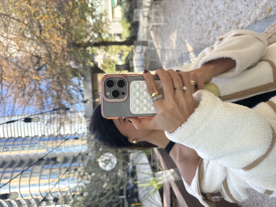 A woman holds a phone with a protective case and a white bubble pop-it toy attached. She wears rings on her fingers and a white fleece jacket with tan trim. The background features a mix of natural and urban elements, including a tree with bare branches, a building with a grid-like facade, and possibly outdoor seating. The overall scene suggests an outdoor or urban setting. The image is rotated counterclockwise.