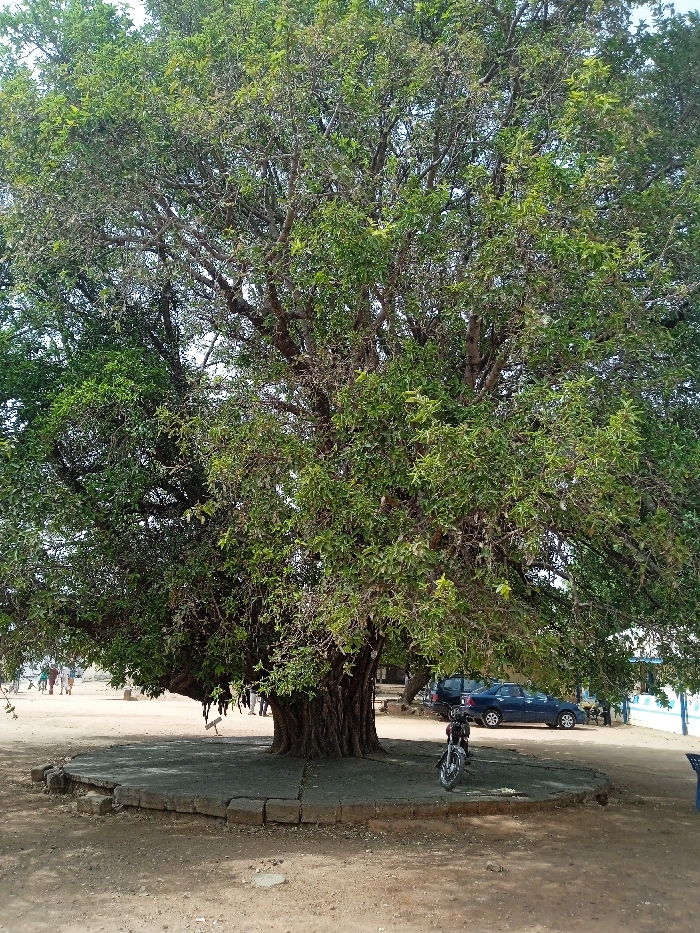 A large, mature tree with dense green foliage dominates the scene. Its thick trunk is surrounded by a circular concrete platform. A parked motorcycle rests in the tree's shade. In the background, people walk on a sandy area, and cars are parked near a building with a blue and white exterior. The scene is captured in daylight.