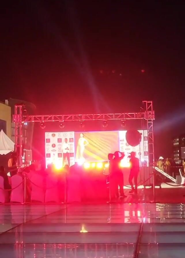 The video captures a night-time outdoor event, likely a show or presentation. A stage is illuminated by bright, colorful lights, predominantly red and white. On the stage, a large LED screen displays images or visuals. Silhouetted figures, possibly crew or staff, are visible around the stage, as well as some people seated nearby. The ground in the foreground is reflective, possibly glass or a wet surface, mirroring the light from the stage. Some buildings are faintly visible in the background.