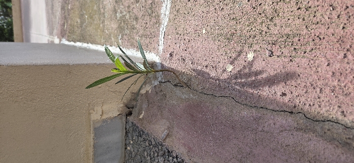 - "This image, located in Glifada, Greece, depicts a single plant approximately 15-20 centimeters tall, with multiple green, lanceolate leaves, emerging from a linear crack in a reddish-pink paved surface" by FM-p7YQZ2, licensed under CC BY 4.0