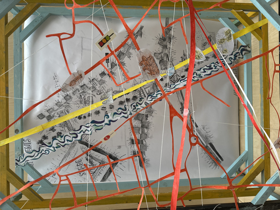 An abstract composition features a hand-drawn map on white paper. Black and white buildings and a river with wavy blue and green patterns are prominent. Red paper cutouts representing roads overlay the map, along with yellow tape strips. A small cut-out of a traffic light is visible. The map is framed by a multi-colored wooden structure of light blue, yellow, and natural wood tones, creating a three-dimensional effect. White strings are stretched across, adding to the chaotic, artistic style.