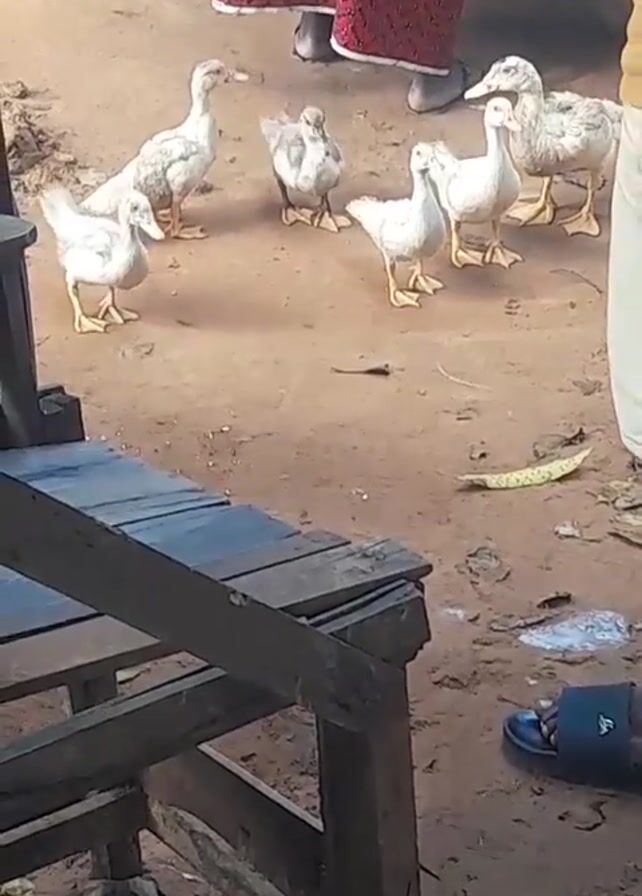 seven white ducks standing on a dirt ground. A person in white shorts and sandals walks into the scene, causing the ducks to move away. In the foreground, there's an old wooden bench, and other people can be seen in the background.