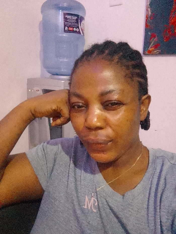 A close-up, waist-up portrait captures an adult female situated indoors in what is identified as the city of Warri, Nigeria