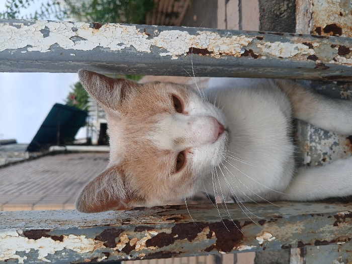 - "An orange and white domestic cat is positioned between two heavily rusted vertical metal bars with peeling white paint" by FM-YF5w12, licensed under CC BY 4.0