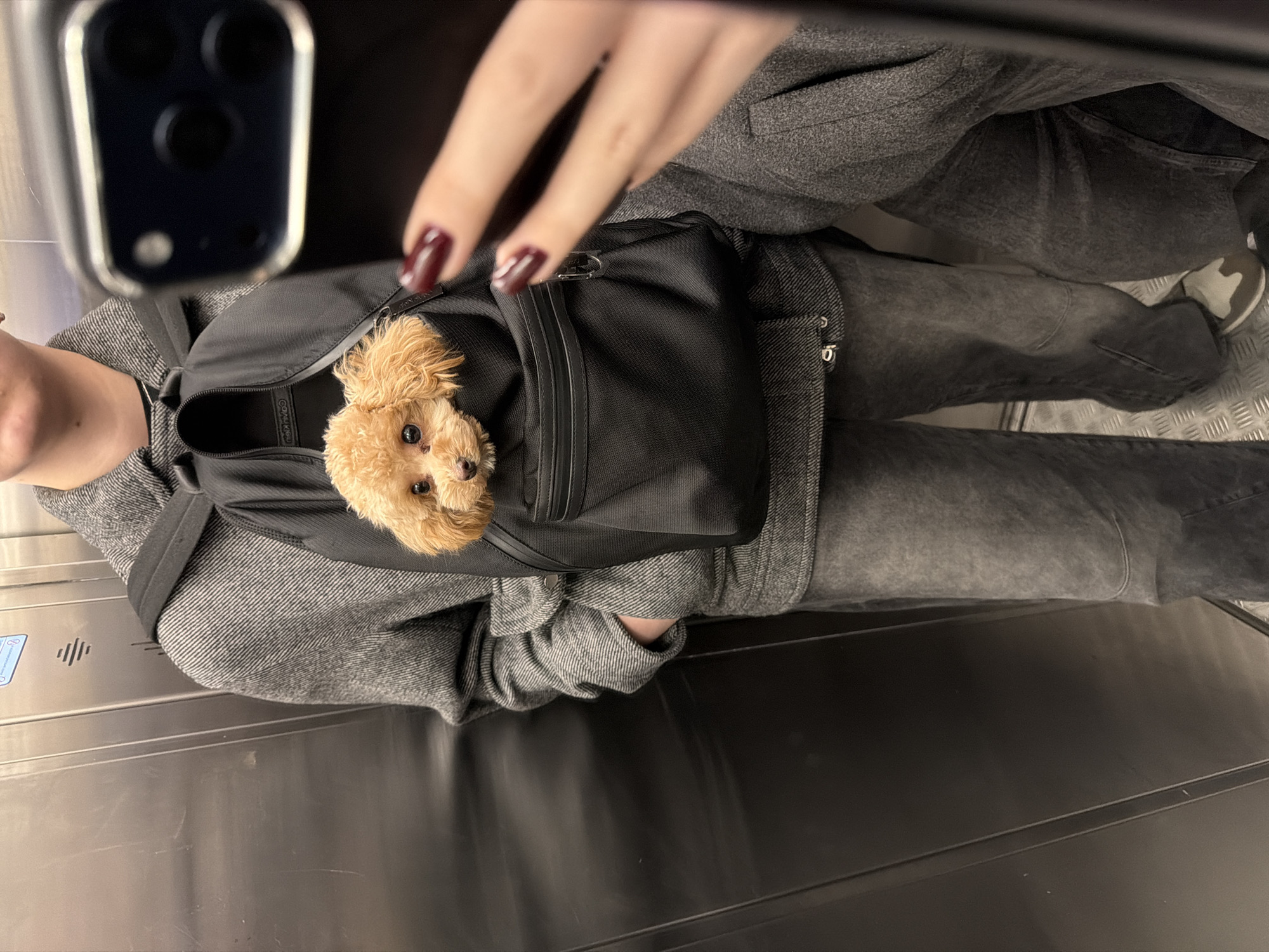 A first-person view taken from inside an elevator. A person wearing gray clothing and denim jeans is holding a black carrier bag with a small poodle inside. The person is holding a phone with a camera lens in the upper left of the frame. The person has painted fingernails. The elevator walls are stainless steel. The floor is a metal grid. The location may be Murino, Russia.