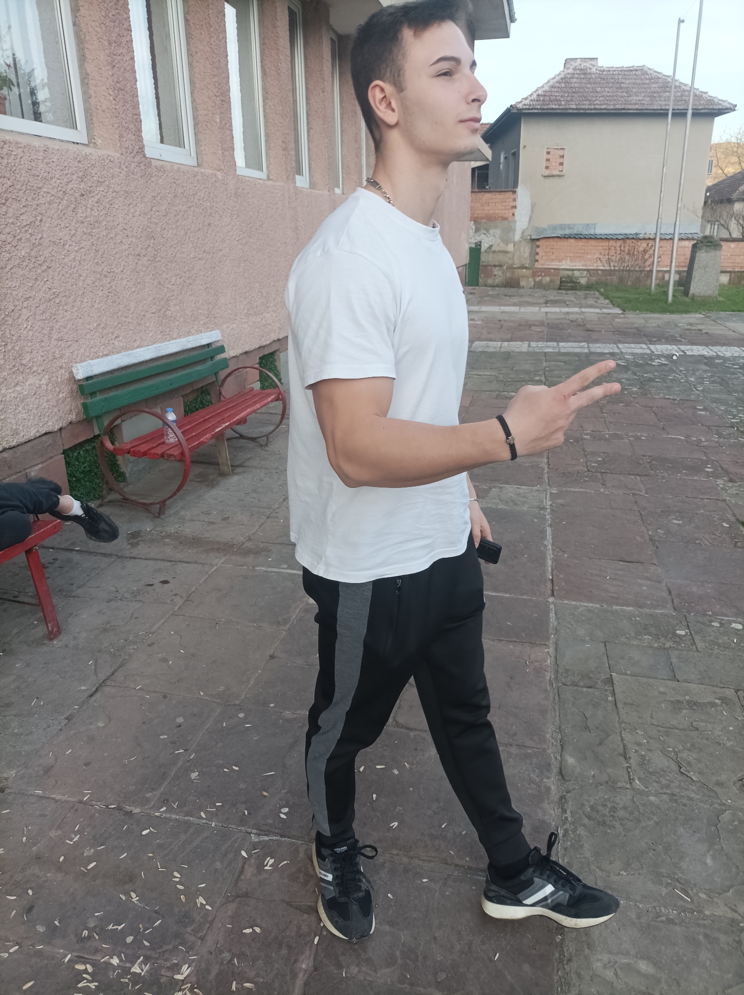 A young man stands in an outdoor area with weathered, interlocking stone pavement. He is facing right, wearing a white t-shirt, black sweatpants with gray side stripes, and black sneakers with white accents. He has short dark hair and is making a peace sign with his right hand, holding a small black object in the same hand. He is wearing a black bracelet on his right wrist. Behind him to the left is a light pink building with multiple windows and a bench with a red seat and green trim. Another person's leg is visible on a bench on the left. Further back is a one-story building with a tiled roof. The location is Reselets, Bulgaria, based on visual cues consistent with the architectural style.