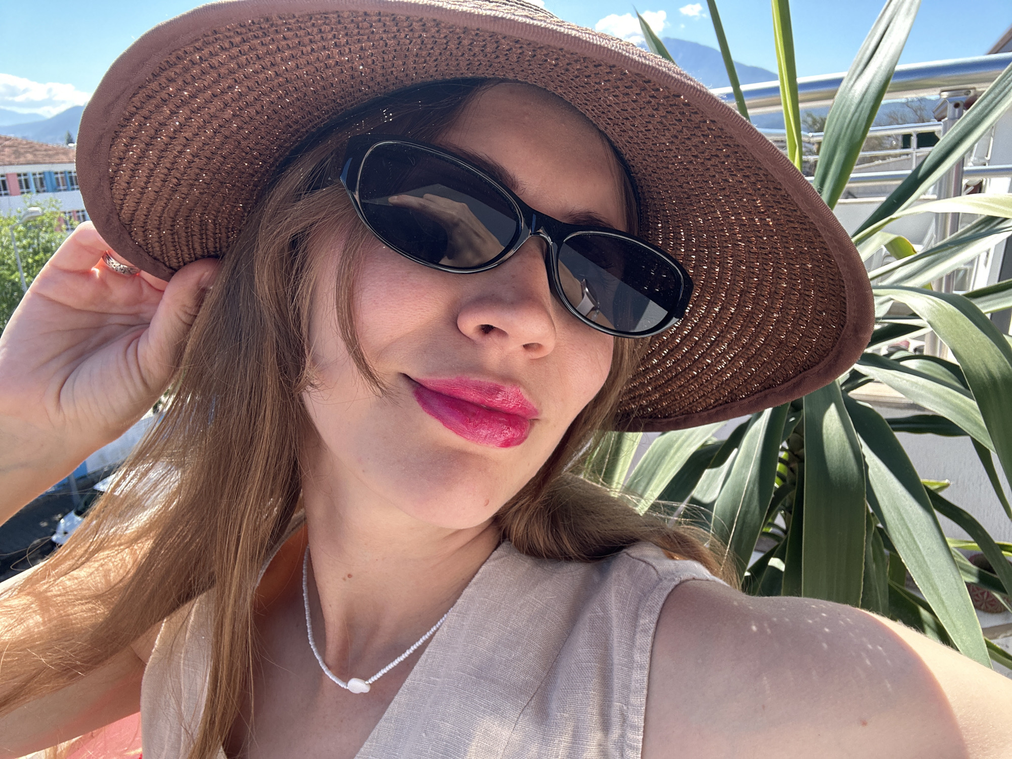An adult female is depicted in a frontal, close-up, selfie-style photograph, positioned outdoors under bright sunlight. She wears a brown woven straw hat, dark oval-shaped sunglasses, and bright pink lipstick. Her light-brown hair is visible beneath the hat, framing her face and shoulders. A white beaded necklace featuring a central, irregularly shaped white bead is visible around her neck, complementing a light-colored, sleeveless top. Her right hand, wearing a ring on the ring finger, lightly touches the brim of her hat on the viewer's left side. The background on the left reveals residential buildings with red-tiled roofs and multi-colored window frames, indicative of local architecture in Fethiye, Turkey. Distant mountains rise under a clear blue sky with scattered white clouds. On the right, large green, sword-like plant leaves extend into the frame, partially obscuring a metallic railing. The setting indicates an elevated position, likely a balcony or terrace, in Fethiye, Turkey.