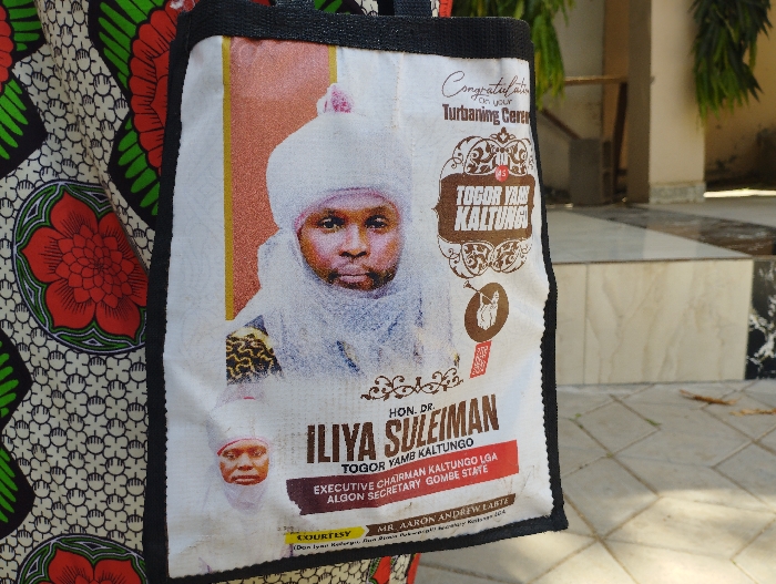 white tote bag with black handles. The bag is printed with a picture of a man wearing a white turban and white robe. The man is looking directly at the camera and has a serious expression on his face. The text on the bag reads "Congratulations on your Turbaning Ceremony", "TOGOR YAM KALTUNGO", "HON. DR. ILIYA SULEIMAN TOGOR YAM KALTUNGO", "EXECUTIVE CHAIRMAN KALTUNGO LGA ALGON SECRETARY GOMBE STATE", and "COURTESY MR. AARON ANDREW LABTE". The bag is being held by a person wearing a floral dress. The image was taken in Kaltungo, Nigeria, at the coordinates (latitude: 9.816, longitude: 11.315). The image is taken from an angle that shows only the front of the bag. The background of the image is a blurry view of a tiled floor. There is a small amount of green foliage visible in the top right corner of the image. The image is well-lit.