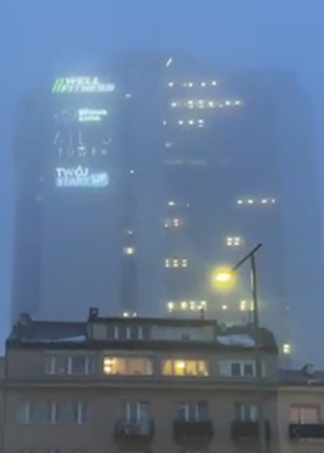 A tall building, partially obscured by fog, is the main focus of the video. The building has multiple visible signs, including "WELL FITNESS", "biznes zone", "ATLAS TOWER", and "TWÓJ START UP". The building is illuminated with lights from within, giving it a hazy glow through the fog. In the foreground, there is a smaller, older building with visible windows and balconies. A street is present in the lower part of the frame, with a yellow bus driving by. The environment appears urban and the weather condition is foggy.