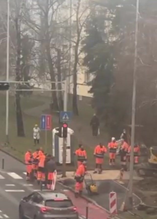 street scene with a construction crew working on a crosswalk. The crew, dressed in bright orange safety gear, is gathered near a traffic light and a portable toilet. Some members of the crew appear to be operating machinery on the crosswalk, which is marked with red paint. Pedestrians can be seen walking in the background, along a winding path through a park or green space with bare trees, indicating it might be late fall or winter. A grey car is stopped at the intersection, likely waiting for the construction to clear. The video seems to be taken from an elevated position, possibly from a building overlooking the street. The weather appears overcast or foggy.