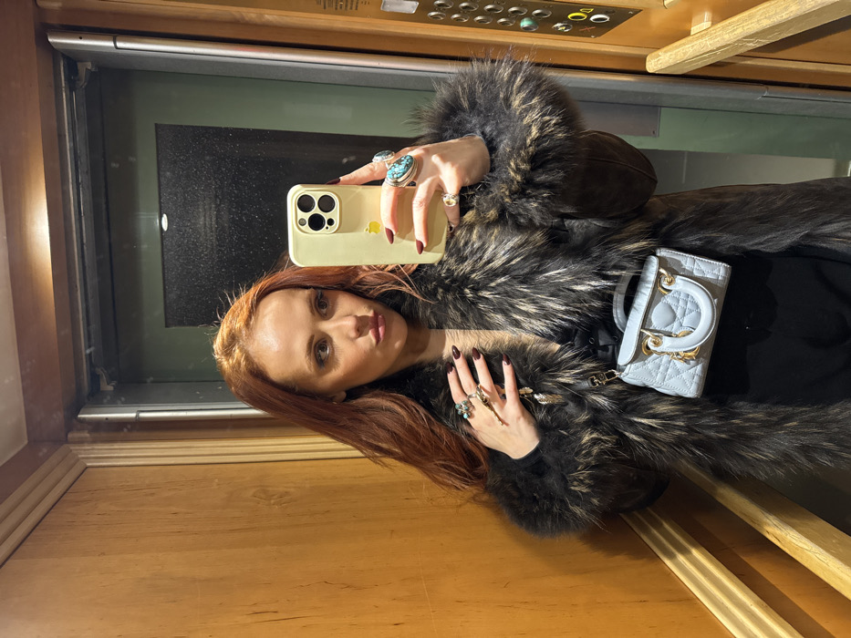 A woman with long red hair takes a selfie in a mirrored elevator. She wears a large fur coat with dark accents and a light blue purse with gold hardware. Multiple rings adorn her fingers. The elevator has wooden panels on the walls and ceiling, with a control panel visible near the top. The reflection shows a dark, possibly windowed or paneled, wall behind the woman.